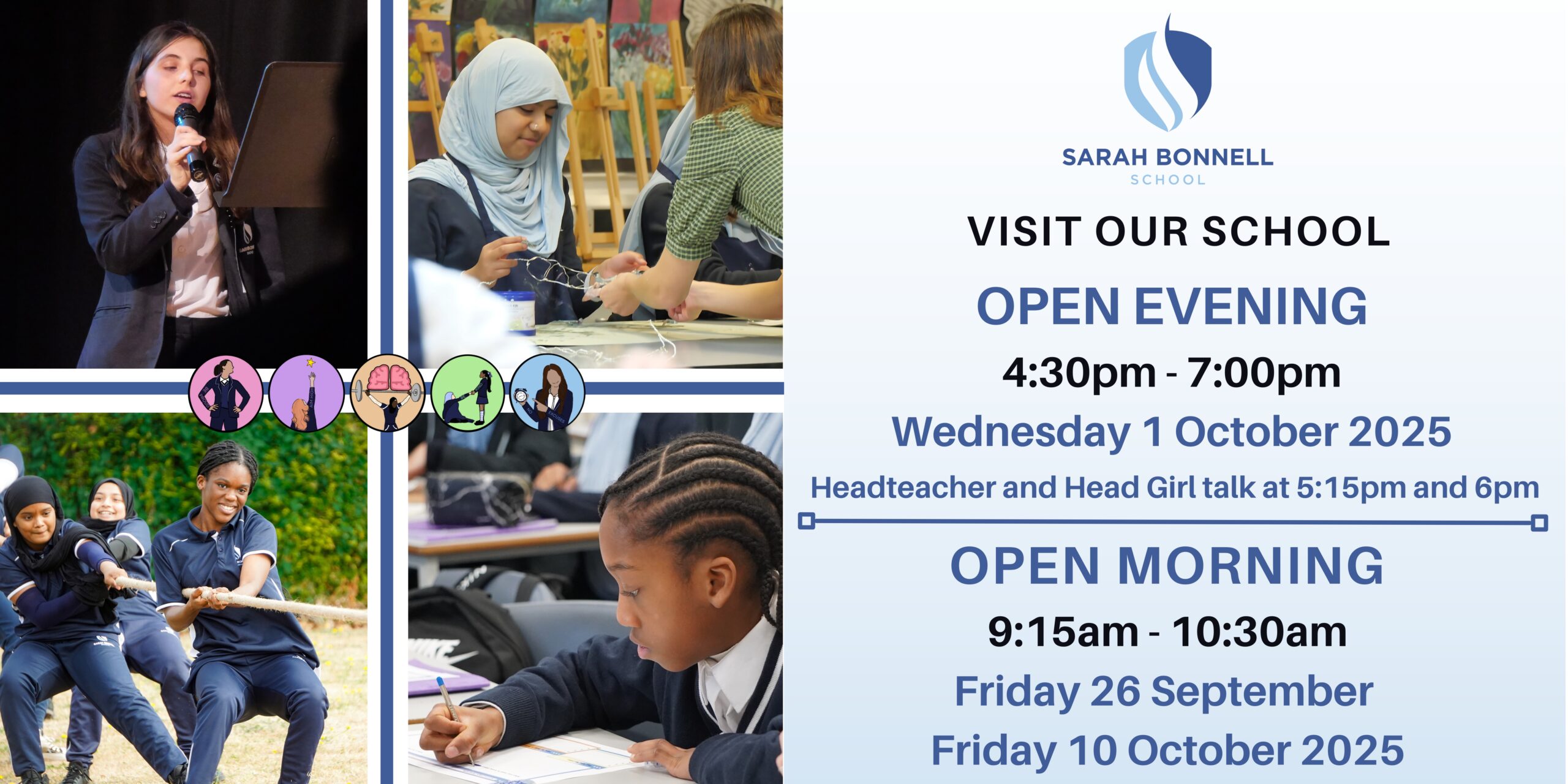 Parents and carers can visit our school during the open evening and morning events in the new academic year. Students starting Year 7 in September 2026 will have the opportunity to visit Sarah Bonnell School during our induction programme which takes place in July 2026.