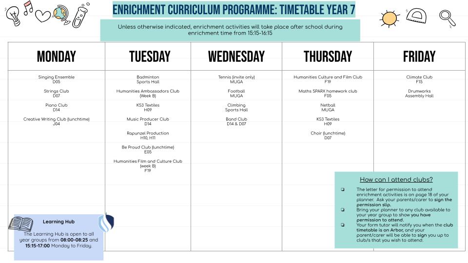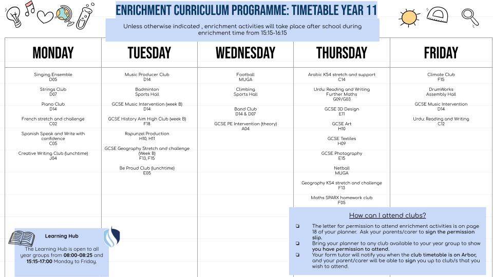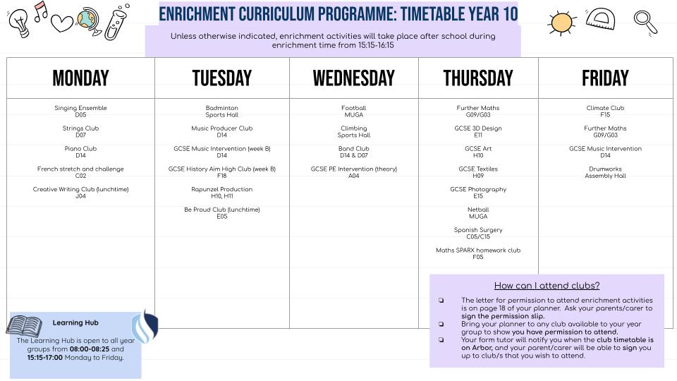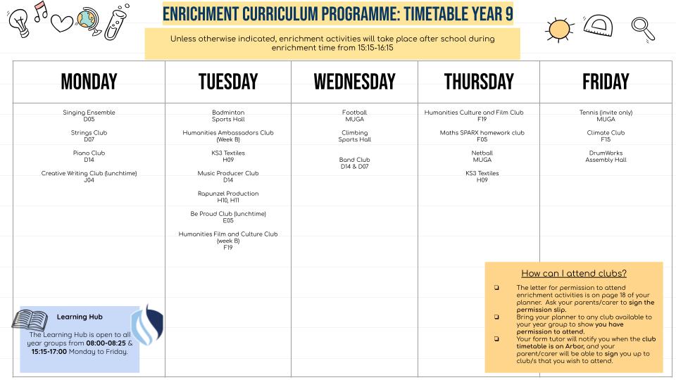Sarah Bonnell offers a wide range of afterschool clubs to further enrich the school experience for our students. This programme supports our commitment as a school to provide a broad and balanced curriculum, inside and outside of lessons. The Enrichment Programme provides students with opportunities to learn beyond the classroom to explore their academic interests, passions and to develop their confidence and leadership skills.