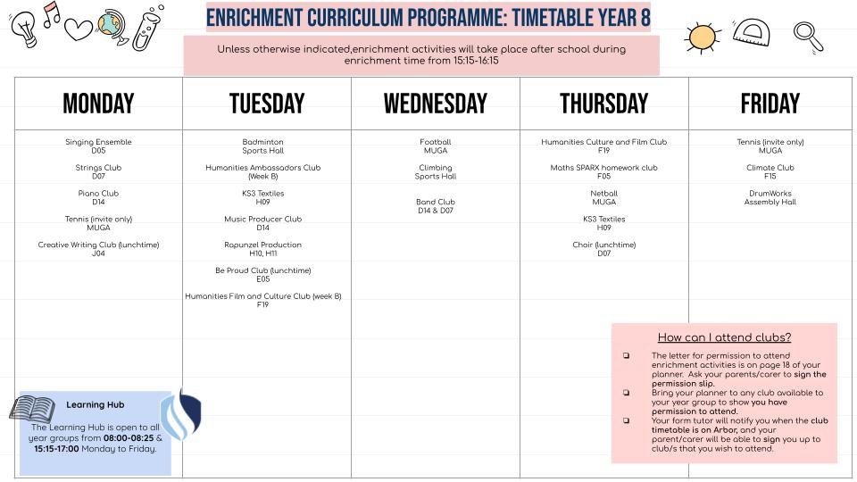Enrichment activities will take place after school during enrichment time from 15:15-16:15