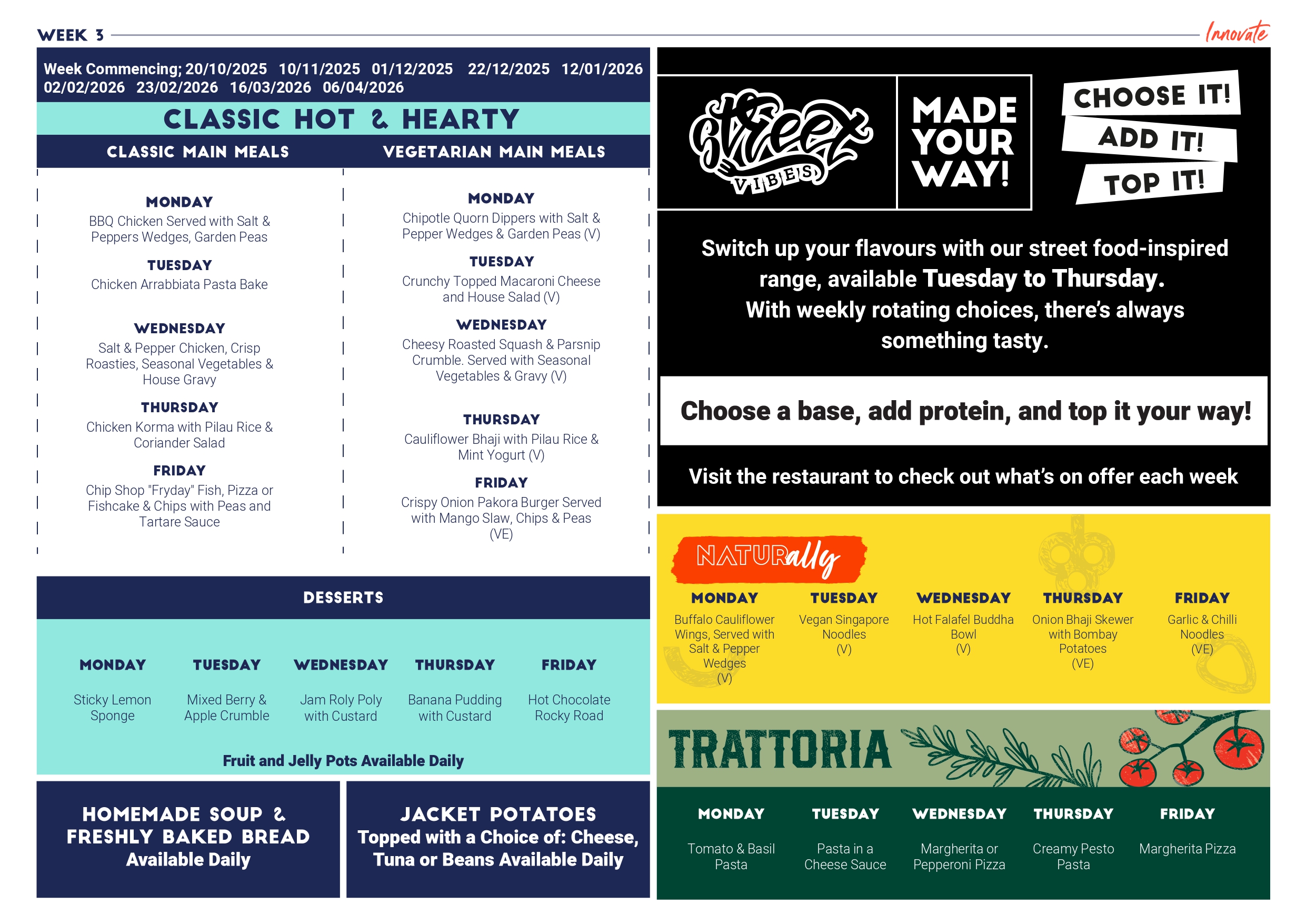 Our main catering offer at lunch provides a meal deal at a cost of £2.70 to students.  There are three separate menus – which run on a rolling cycle.