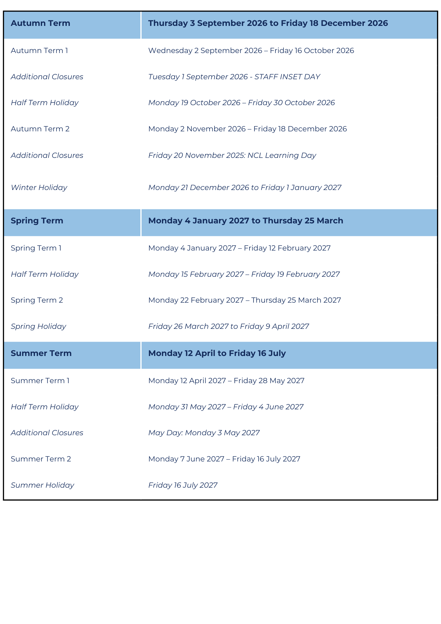 Term Dates and School Day Term and holiday dates for the academic year 2025-2026 School Day In a typical week the school provides a total of 32 hours and 30 minutes to all students in Years 7 – Year 11. Term and holiday dates for the academic year 2026-2027